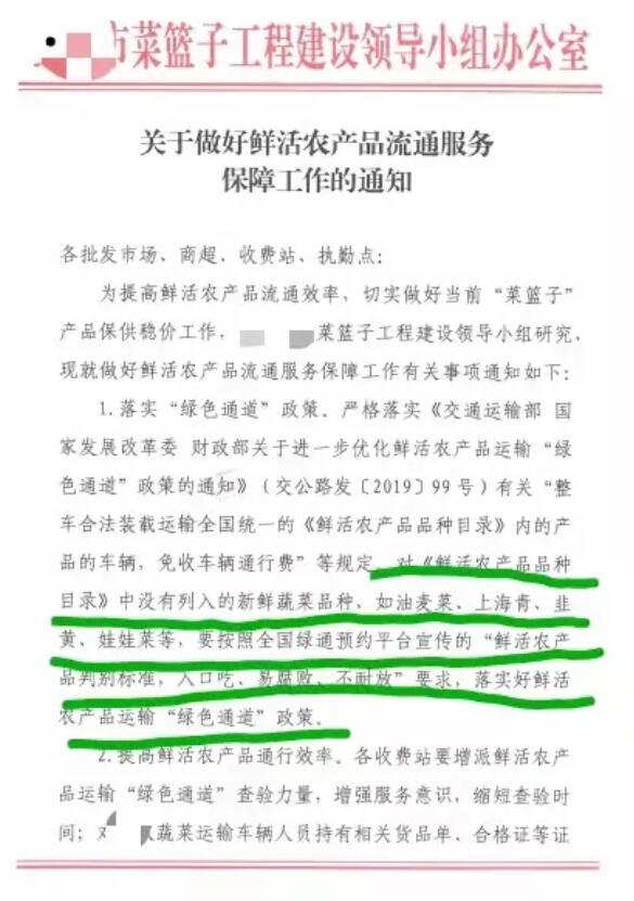 據(jù)全國(guó)部分主流官方媒體報(bào)道:11月初,中部某地方“菜籃子”工程建設(shè)領(lǐng)導(dǎo)小組辦公室發(fā)出通知,外地車(chē)輛運(yùn)輸蔬菜進(jìn)入該城市,非《鮮活農(nóng)產(chǎn)品品種目錄》內(nèi)的蔬菜品種,應(yīng)按照國(guó)家關(guān)于鮮活農(nóng)產(chǎn)品判別標(biāo)準(zhǔn),享受鮮活農(nóng)產(chǎn)品運(yùn)輸“綠色通道”政策,免收車(chē)輛通行費(fèi)。